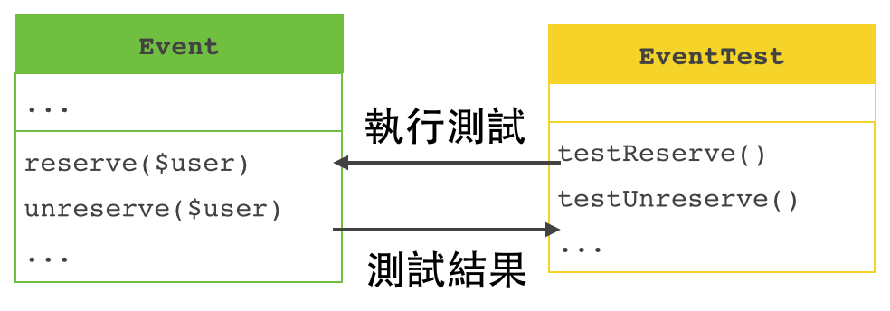從上圖可以看到,撰寫了Event 類別提供了兩個方法,reserve()、unreserve(),也就是目標程式。 接著透過 EventTest 的兩個測試案例,testReserve() 與 testUnreserve() 分別來對 Event 類別中的兩個類別方法執行測試,測試的結果會在測試案例中驗證,如果驗證通過,表示測試就成功了!